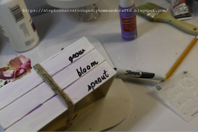 If you have a stencil on hand, take your stencil, and use your pencil to trace any letters or words on the front side of your box. I chose to add words on the right lower side of my box. After, I used a permanent marker to trace my words.