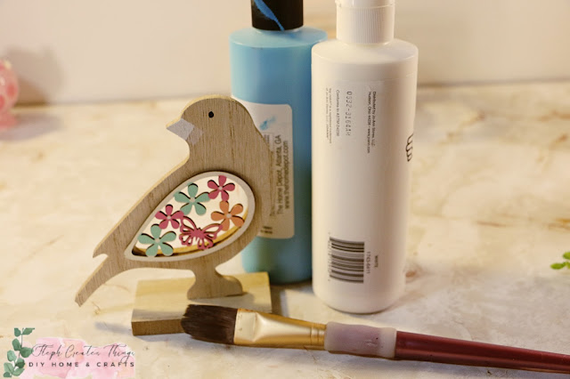 Start with, applying paint to the wooden bird. I recommend mixing white and blue acrylic paint together for a nice color.